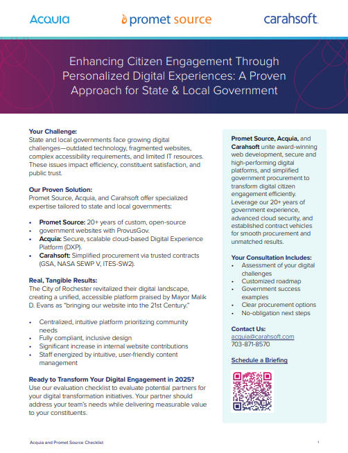 Unlock the Acquia and Promet Source partner evaluation checklist to discover how Public Sector teams simplify procurement for Acquia’s secure, user-friendly DXP. With Promet Source’s expert technical support, teams can make informed decisions, facilitate digital transformation initiatives, enhance citizen services and maximize ROI.