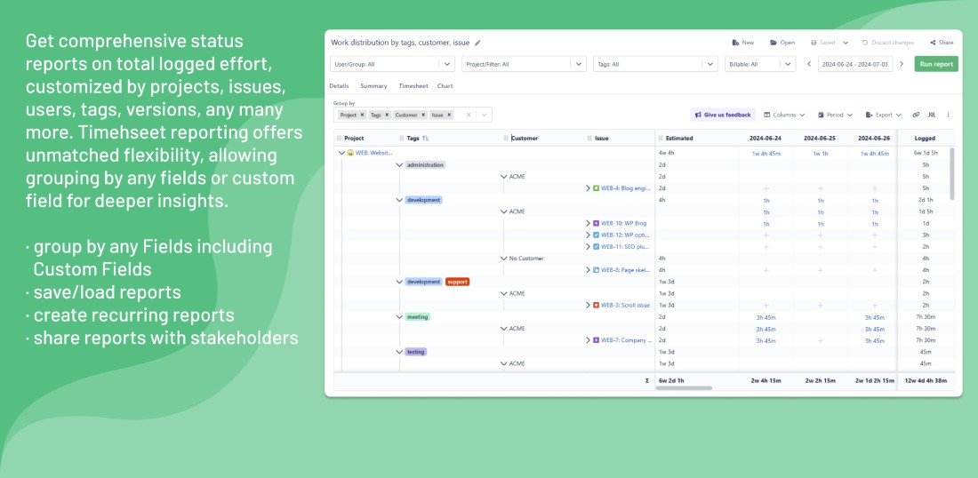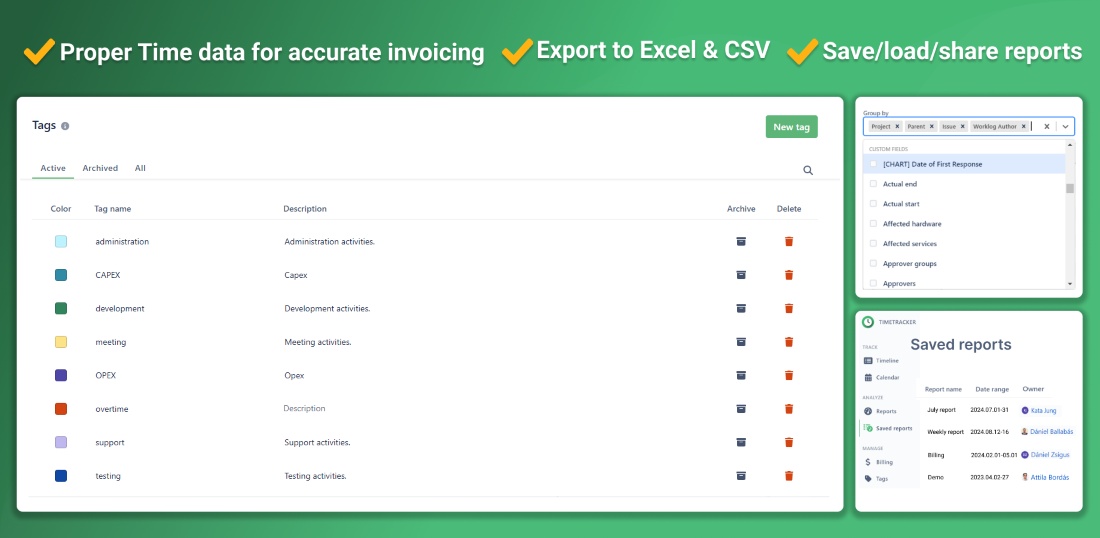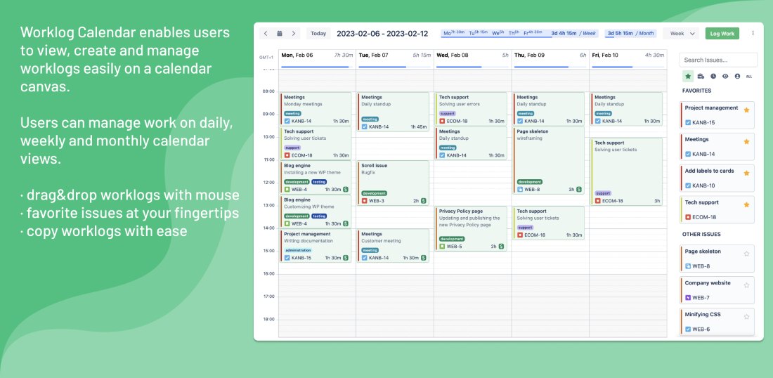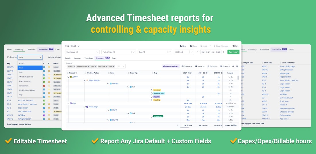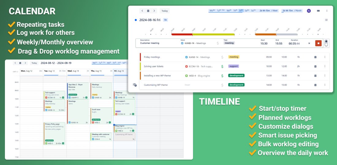 Timetracker for Jira offers editable and interactive timesheets with flexible filtering, grouping by custom fields, and the ability to save, share, and export reports. Users can track their work through multiple views, including Timeline, Calendar, and Issue view, making it easy to get a clear daily, weekly, or monthly overview. The app also provides tools like start/stop timers, repeating tasks, drag-and-drop worklog management, and bulk editing for efficient time tracking. For billing and invoicing, it ensures accurate time data, allows exporting to Excel or CSV, and uses worklog tags or Jira custom fields to match worklogs with clients or invoices.