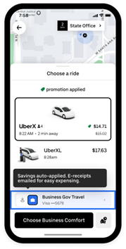 Get started with Uber’s government-wide travel program for employees. Access discounted rides, meals, and simple expensing—all in one app.